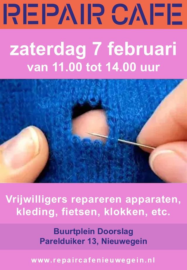 Zaterdag 7 februari is er Repair Café in Buurtplein Doorslag. Deskundige reparateurs gaan samen met jou aan de slag om je kapotte spullen te repareren, onder het motto: “Weggooien? Mooi niet!” Er is een textielhoek waar kleding versteld wordt, een team reparateurs dat apparaten repareert, een klokkenmakker, een messenslijper en een fietsenmaker.