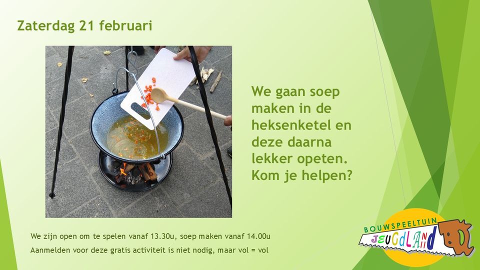 Spelen kan van 13.30-16.30 uur en tussendoor kun je meehelpen om de groente voor de groentesoep te maken. Natuurlijk mag je hem ook proeven als hij klaar is.