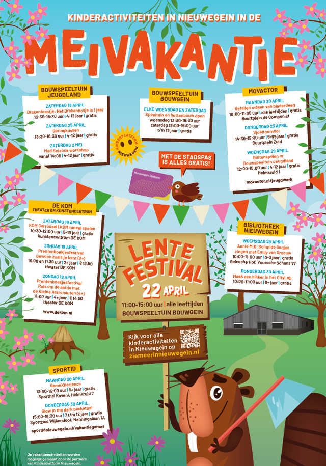 Tijdens de meivakantie (18 april - 3 mei 2026) is er van alles te doen en beleven voor kinderen van alle leeftijden. Twee weken lang zijn er allerlei activiteiten te vinden. KOM toneel spelen of bezoek het prentenboekjesfestival bij Theater en Kunstencentrum DE KOM, zing mee met Annie M.G. Schmidtliedjes bij Bibliotheek Nieuwegein, of doe mee met Glow in the Dark basketbal via SportID. Zin in wat creatiefs? Bezoek dan één van de buurtpleinen van Movactor. Op zoek naar iets actiefs of sportiefs? Kom dan buitenspelen bij Bouwspeeltuin Bouwgein of Jeugdland. Tijdens de meivakantie is er voor ieder wat wils. Bekijk het hele programma hieronder.