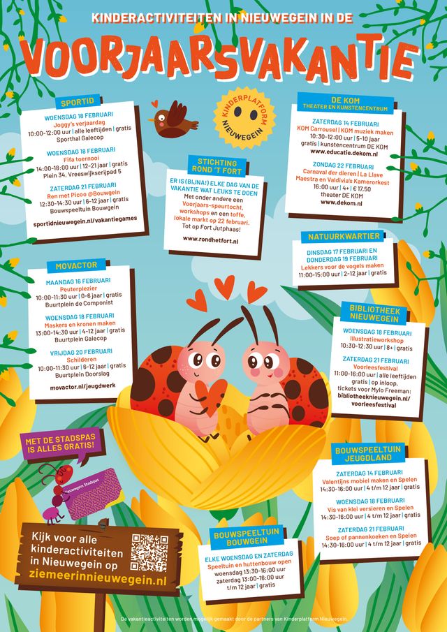 Tijdens de voorjaarsvakantie (14 - 22 februari 2026) is er van alles te doen en beleven voor kinderen van alle leeftijden. De hele week zijn er verschillende activiteiten te vinden. KOM muziek maken bij Theater en Kunstencentrum DE KOM, doe een voorjaarsspeurtocht of workshops bij Fort Jutphaas, ga schilderen met Movactor, kom knutselen bij Natuurkwartier of doe een illustratieworkshop bij Bibliotheek Nieuwegein. Liever wat sportievers of actievers? Bezoek dan de activiteiten van SportID of een van de Bouwspeeltuinen. Er is voor ieder wat wils! Bekijk het hele programma hieronder.