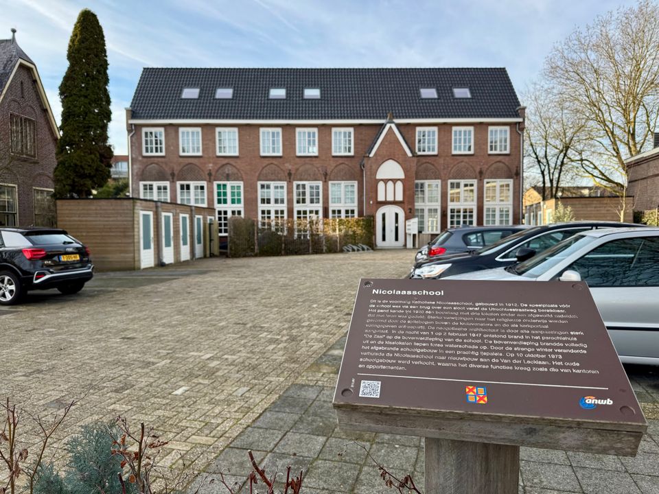 Dit is de voormalig Katholieke Nicolaasschool, gebouwd in 1912. De speelplaats vóór de school was via een brug over een sloot vanaf de Utrechtsestraatweg bereikbaar. Het pand kende tot 1920 één bouwlaag met drie lokalen onder een afgewolfd zadeldak dat met leien was gedekt. Sterke verwijzingen naar het religieuze onderwijs werden gevormd door de spitsbogen boven de kruisvensters en de als kerkportaal vormgegeven entreepartij. De neogotische architectuur is door alle aanpassingen sterk aangetast. In de nacht van 1 op 2 februari 1947 ontstond brand in het parochiehuis “De Zaal” op de bovenverdieping van de school. De bovenverdieping brandde volledig uit en de klaslokalen liepen forse waterschade op. Door de strenge winter veranderde het afgebrande schoolgebouw in een prachtig ijspaleis. Op 10 oktober 1973 verhuisde de Nicolaasschool naar nieuwbouw aan de Van der Lecklaan. Het oude schoolgebouw werd verkocht, waarna het diverse functies kreeg zoals die van kantoren en appartementen.