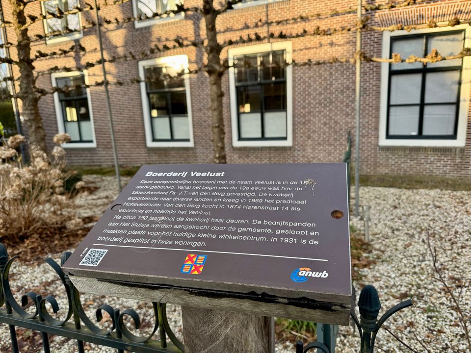 Deze oorspronkelijke boerderij met de naam Veellust is in de 18e eeuw gebouwd. Vanaf het begin van de 19e eeuw was hier de bloemkwekerij Fa. J.T. van den Berg gevestigd. De kwekerij exporteerde naar diverse landen. In 1869 werd het predicaat Hofleverancier verleend. In 1874 kocht Van den Berg het pand Herenstraat 14 als woonhuis. Na circa 150 jaar sloot de kwekerij haar deuren. De bedrijfspanden aan Het Sluisje werden aangekocht door de gemeente en gesloopt op plaats te maken voor een klein winkelcentrum. In 1931 is het pand gesplitst in twee woningen.