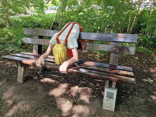 Dit houten beelden is geschilderd in vrolijke, felle kleuren zoals rood, geel en lichtblauw en hoort bij het beeld 'De Oude Man'. Zowel het meisje als de oude man nemen geen van beiden de omgeving in zich op: het meisje hangt over de bank en gaat op in haar spel, terwijl de man al zijn aandacht aan het boek geeft, dat hij in zijn handen heeft. Maar het kan ook zijn dat de man wat zit te dutten met zijn enigszins over zijn hoofd getrokken hoed en zijn donkere bril. De beelden laten ook zien dat verschillende generaties op één locatie het samen goed kunnen vinden: er heerst harmonie.