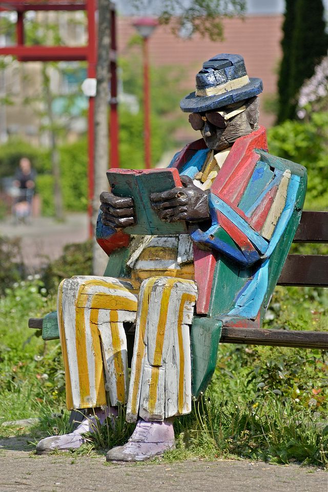 Dit houten beelden is geschilderd in vrolijke, felle kleuren zoals rood, geel en lichtblauw en hoort bij het beeld 'Spelend Meisje'. Zowel het meisje als de oude man nemen geen van beiden de omgeving in zich op: het meisje hangt over de bank en gaat op in haar spel, terwijl de man al zijn aandacht aan het boek geeft, dat hij in zijn handen heeft. Maar het kan ook zijn dat de man wat zit te dutten met zijn enigszins over zijn hoofd getrokken hoed en zijn donkere bril. De beelden laten ook zien dat verschillende generaties op één locatie het samen goed kunnen vinden: er heerst harmonie.