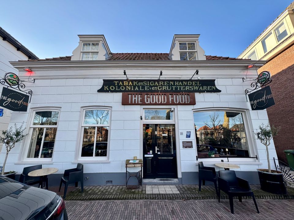 Dat Vreeswijk een beschermd dorpsgezicht heeft is duidelijk te zien aan het houten bord met opschrift boven de deur van dit pand: " tabak- en sigarenhandel, koloniale grutterswaren" . Dit pand is gebouwd in 1838 door Krijn de Jong, koopman uit Vreeswijk. Het heeft vele verbouwingen ondergaan in 1937, 1973 en 1976. In 1973 werd het verbouwd tot kantoorruimte en kwam er de drukkerij " De Lekstroom" waarna het een tijd heeft dienst gedaan als Herenmode zaak Re-Port Men's Wear. Nu doet het dienst als restaurant.